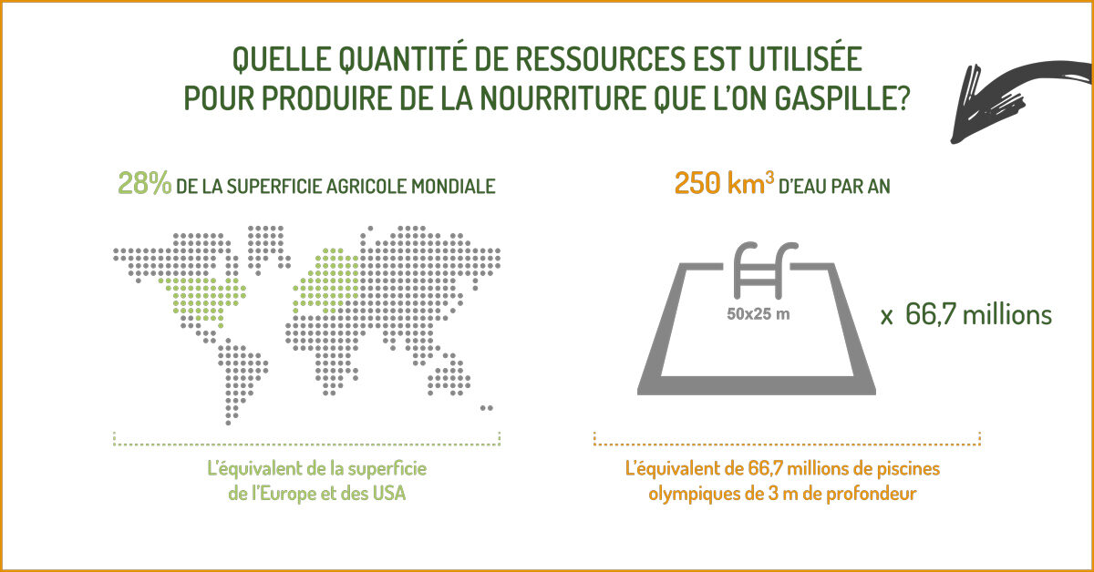 La production, mais également l’élimination de denrées alimentaires qui ne seront jamais consommées, ont des conséquences néfastes sur l’environnement. Ils mobilisent inutilement des ressources telles que l’énergie, les terres cultivables, l’eau, le carburant, les engrais ou encore les pesticides.