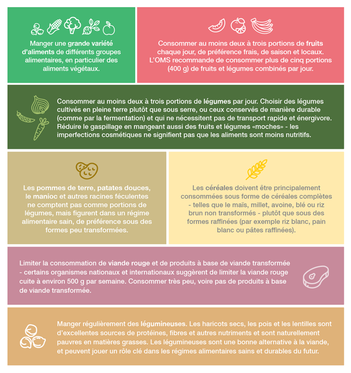 La composante végétale y est abondante et variée (céréales complètes, légumes et fruits, légumineuses et fruits à coque représentent ensemble près de 850 g par jour). L’assiette EAT-Lancet contient relativement peu de produits animaux, mais n’est pas exclusivement végétale. Elle favorise les graisses insaturées aux graisses saturées, et limite les quantités de céréales raffinées, d’aliments ultra-transformés et de sucres ajoutés. C’est avant tout un moyen simple et visuel de composer vos repas!