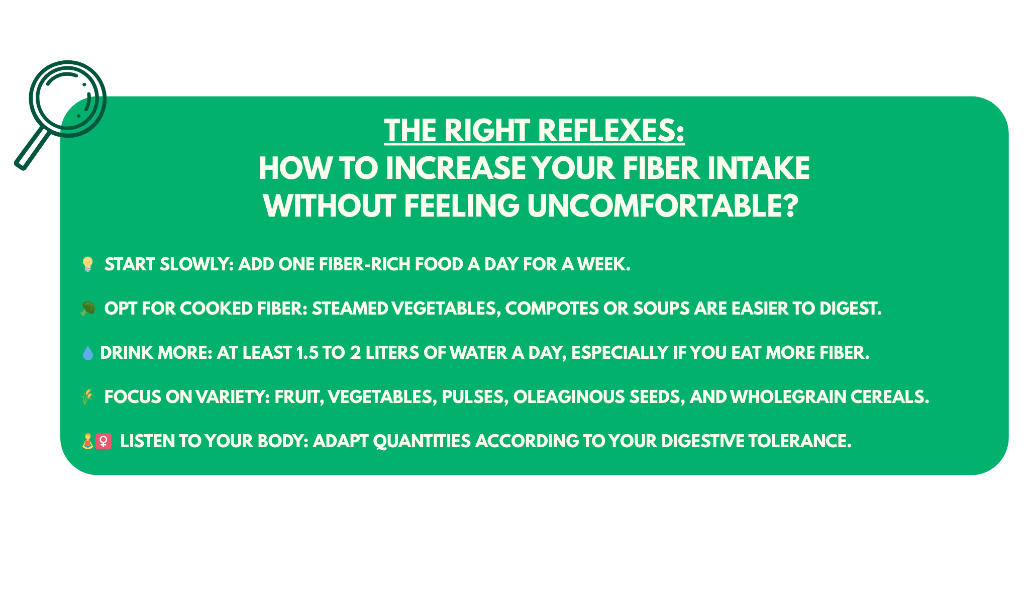 It’s true that introducing more fiber into your diet can cause some intestinal turbulence! But that’s no reason to turn your back on it! The discomfort is often temporary and usually occurs when the body is not used to processing as much plant matter. The solution? Eat fiber regularly, drink plenty of water (essential to prevent blockages), vary your sources of fiber, and change the way you prepare and cook vegetables.